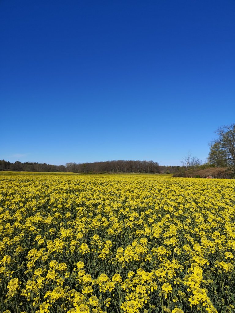 Helt fantastiskt att framme i Östanå färjeläge plötsligt befinna sig mitt emellan de båda storslagenheterna. Det verkar som om raps bara odlas här i kommunen i år, så du skåning i förskingringen som saknar något nu i maj se här ett tips!