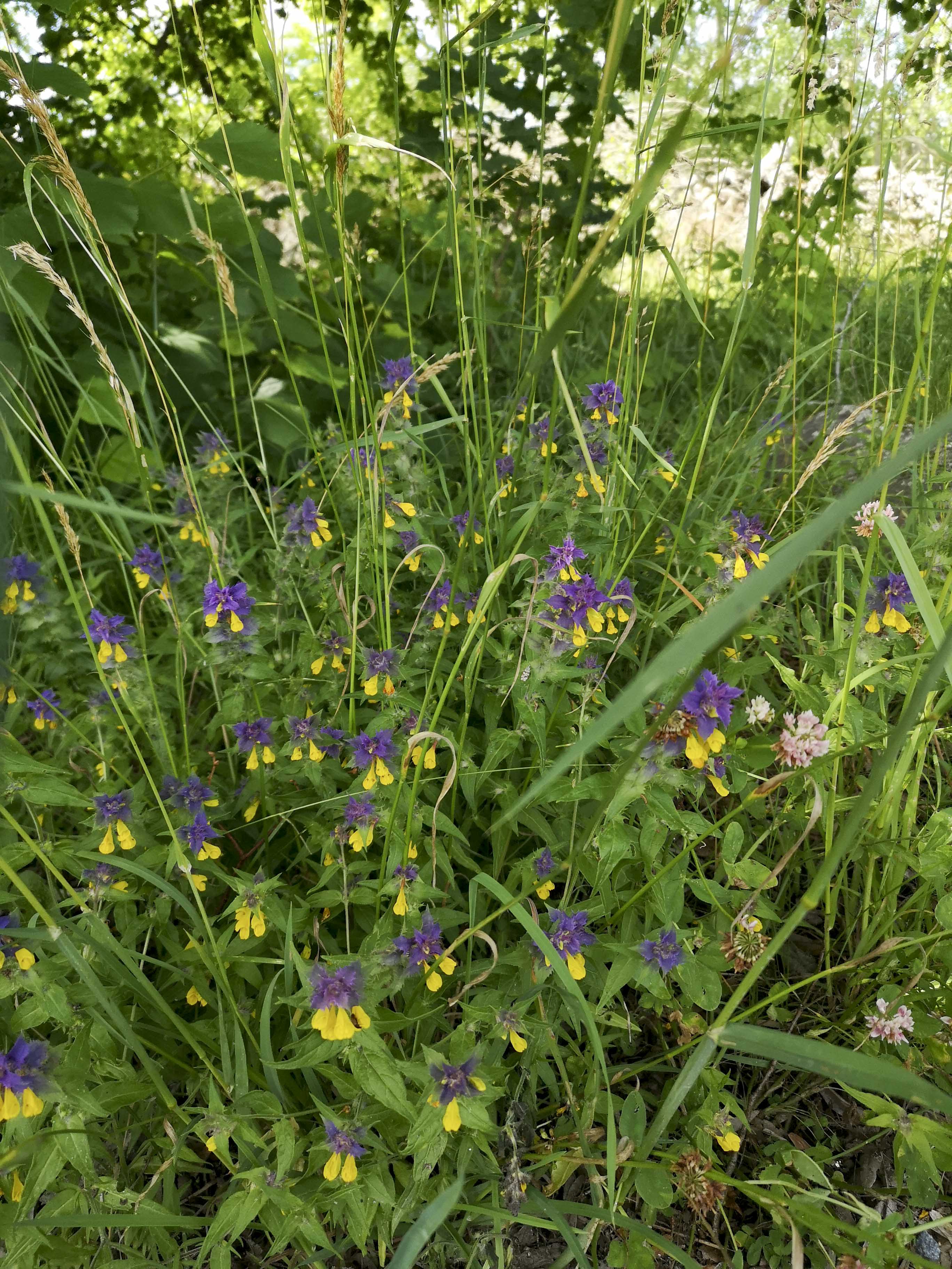 Det här är Natt och dag, fyndigt namn, eller hur? Den blommar lite överallt i Österåker, här fångad i allén till Penningby slott, och växten är också vanligast här i Uppland. Melampyrum nemorosum tillhör snyltrotsväxterna vilket säger vad det är fråga om: Natt och dag snyltar, parasiterar, på andra växters rotsystem. Jag hade aldrig sett växter med två olika sorters blommor på innan, men det har jag inte nu heller; de gula är blommor, men de blåvioletta är blad, högblad.