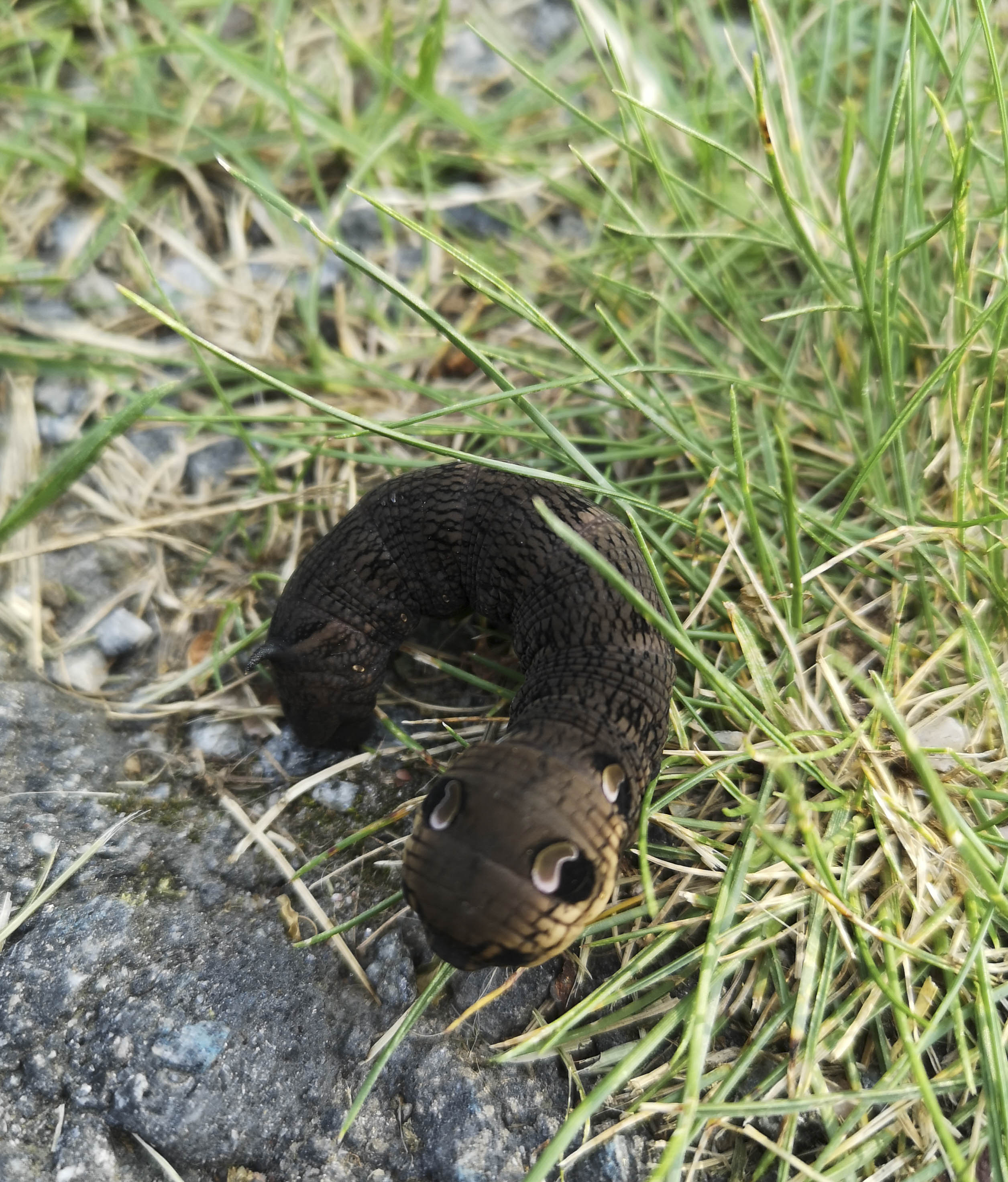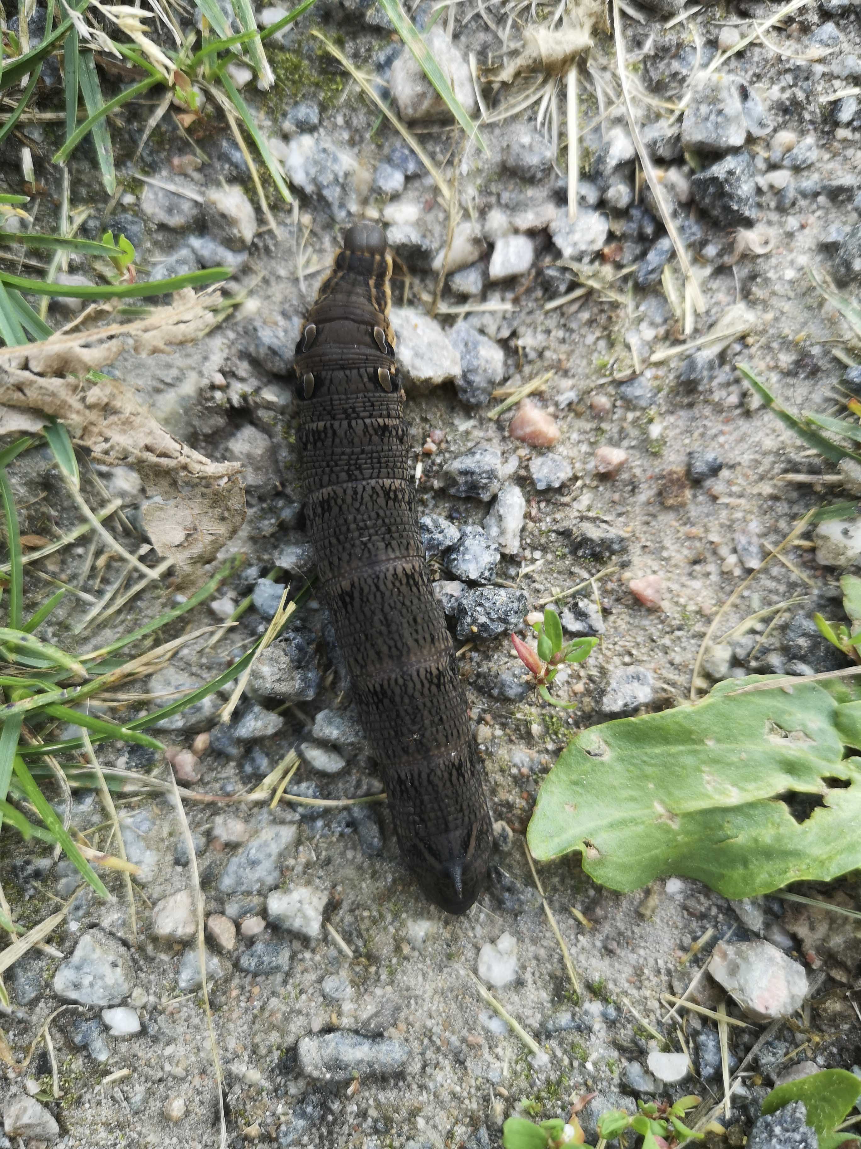 Den här gjorde både mig och min hund förfärad när jag träffade på den vid gångbanan bredvid Åkers kanal i Åkersberga, men bara en av oss tog ett skutt bakåt. Är det en ormunge? Nej, berättade en insatt kompis, den har bara blåst upp huvudet för att skrämmas, det här är en larv till det som ska bli Större snabelsvärmare, Deilephila elpenor.
