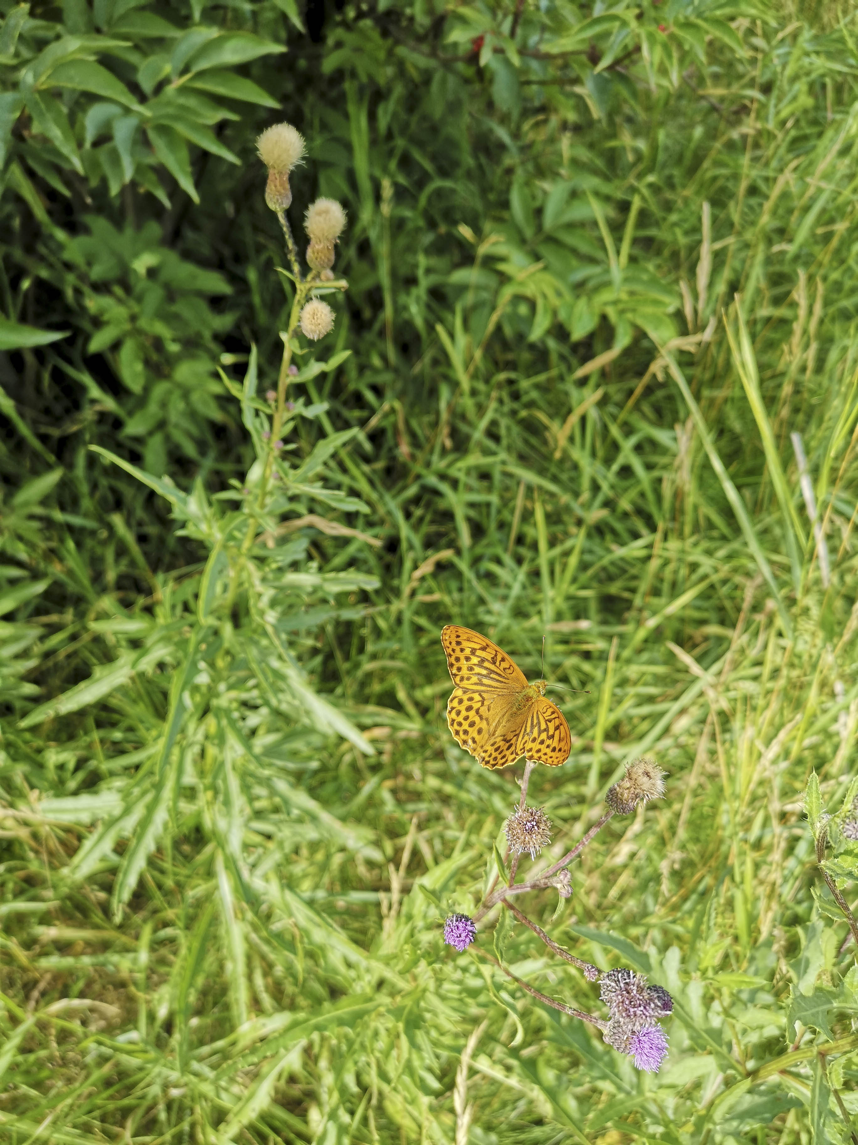 Lika stor är den här vackra fjärilen: Silverstreckad pärlemorfjäril, Argynnis paphia. Den syntes i skogsbrynet till höjden vid Svinningevägen i Åkersberga mellan helikopterplattformen och Pilstugetorget.