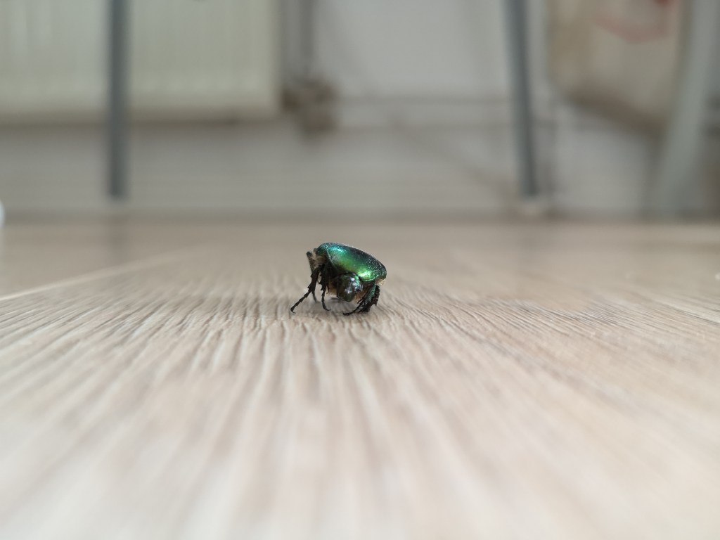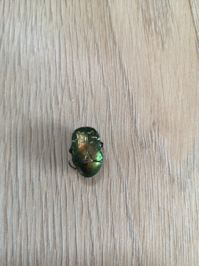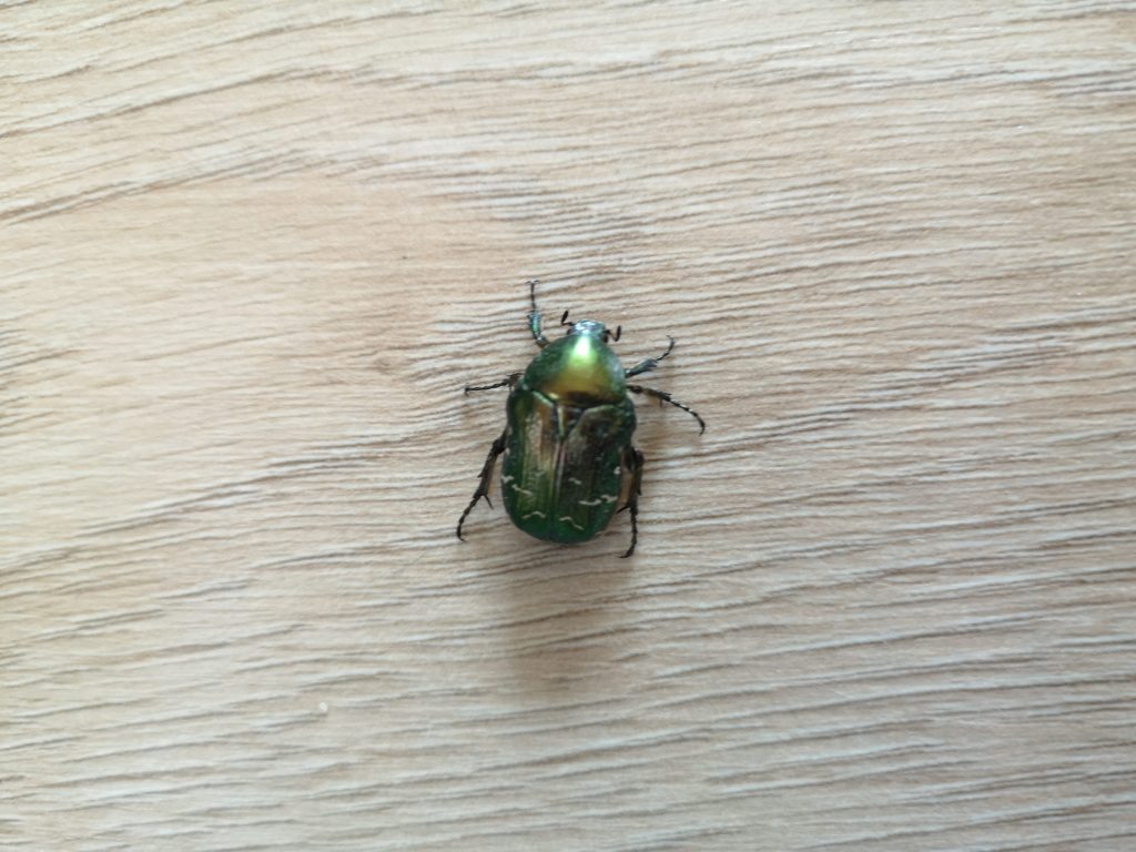 Nåväl, till slut kom jag fram till bladhorningarna och tyckte då att den olivgröna guldbaggen var på pricken lik. Tills jag såg att min besökare ju inte hade några prickar på skölden utan våglinjer! Men när jag tog bort tummen från sidkanten så tittade cetonia aurata fram: gräsgrön guldbagge och där satt den såväl i boken som på mitt golv!