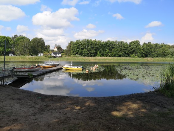 När vädret tillåter -vilket inte är så ofta under sommaren egentligen- älskar jag att cykla hit på förmiddagarna för en upplevelse som stannar kvar i kroppen hela dagen. Jag går på stabil sandbotten ut i vattnet mellan blommande näckrosor, trollsländor, skräddare och små fiskar och simmar en bit och bara njuter. I år är det lyxigt rensat en lianfri ränna mellan näckrosorna, och uppe på den lilla stranden är det som alltid rent och fint. Här finns några bänkar också om man inte vill lägga sitt badlakan och sig själv på gräsmattan. Runt om sjön ser det annorlunda ut: vassen är hög och tät i breda led från sjöns kanter och ut i vattnet. Men här vid den gamla ångbåtsbryggan är det rensat för en liten öppning på typ 20 meter varav hälften utgörs av sandstrand. Oasen beror på dem som bor runt om och ingår i villaföreningen. Och det är därför jag skriver detta blogginlägg.