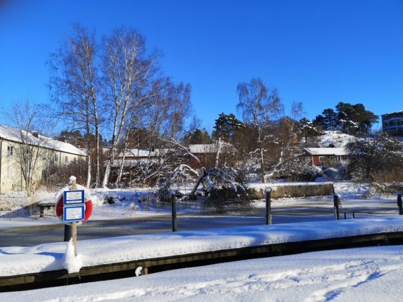 (I natt 6-7 februari var det premiär för konstbelysningen på Slussholmen att fungera, hela natten växlade uppåtriktade strålkastare om med att belysa träden i grönt eller blått. Varför? Vattnet vid dämmet är också skarpt upplyst i blått om nätterna, gillar fiskarna det? Suck. Klåfingrigt om ni frågar mig, en katastrof ifall djur- och fiskliv förstörs. Skulle vilja veta!?)