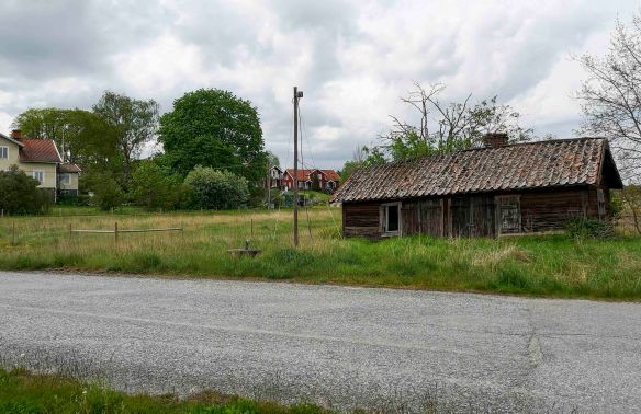 Innan vi går över Svinningevägen ska vi först titta på ett numer litet rött ruckel vänster om infartsvägen till helikopterföretaget vid Svinningevägen, se första fotot nedan. Uthuset står öster om Husby och hänger ihop med den husklungan på så sätt att det här var Husbys tvätthus. Öster om tvätthuset i sin tur har det funnits en vattenkälla, men idag är där bara ett gyttjigt dike. Fotot därefter visar hur Krondiket kommer fram på sydsidan av Svinningevägen efter att ha gått i kulvert under vägen och sista bilden i sekvensen visar hur det ser ut om man vänder ryggen mot Svinningevägen och blickar söderut istället. Vassranden som döljer Krondiket löper bredvid Näsvägen tills diket kulverterat korsar densamma.