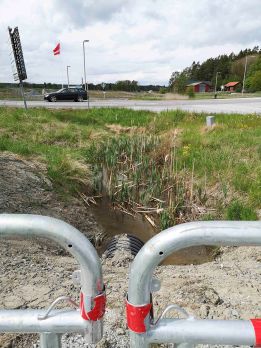 På andra sidan av rondellen dyker ån upp igen, bild 1 nedan, och ringlar sig därefter ner till Hjulvägen som kommunen nu har förlängt och iordningsställt för färd från Näsvägen till Båthamnsvägen. Här vid Hjulvägen vinklar Krondiket in sig för att gå rakt under vägen, se bild 3. Innan det gör det så på bild 2 nedan syns i fonden en av flaggorna vid Sågvägens rondell. Sista fotot visar arrangemanget för att dels få vattnet under Hjulvägen, dels behålla bilar och fotgängare på vägen.