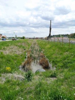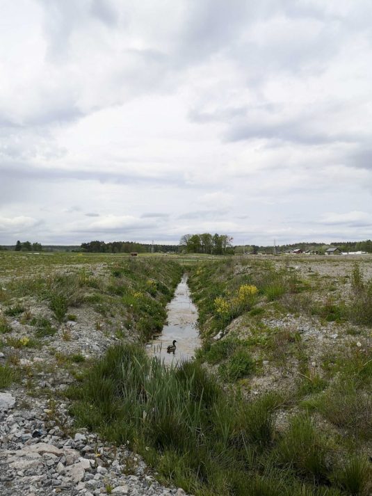I den karga biotopen finns här ändå såväl rara blommor som häckande tofsvipor, sothöns, vattensorkar och rovfåglar. I bakgrunden på bild 2 syns Husby. Vänder man ryggen åt dammen så ser man på bild 3 början på Krondiket som alltså har ett kulverterat utflöde från sagda vattenpöl.