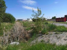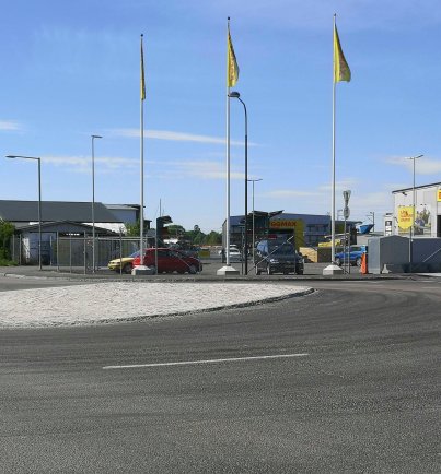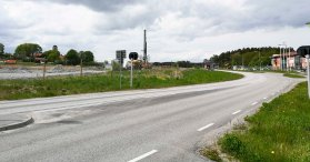 På första fotot nedan kommer Krondiket synligt mot oss från norr men går här under Näsvägen. På bild 2 tittar diket fram igen och går i en vassrand ner mot och förbi brandstationen. Diket går ovan jord fram till järnvägen. Sen kulverteras det genom företagsområdet som är beläget mellan järnväg och Sågvägen. Vet man att Krondiket finns så anas sträckningen på sista bilden. Lägg märke till flaggorna vid Sågvägens rondell.
