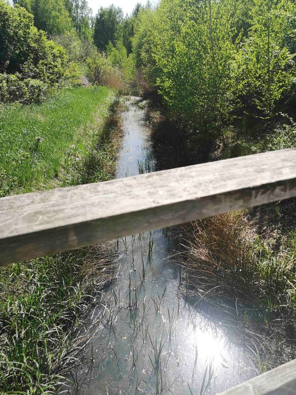 Kulverten släpper ut ån söder om Hjulvägens nya förlängning och en träbro leder kommande fotgängare och cyklister över vattenflödet, väldigt gediget anlagd konstruktion! Väster om ån börjar en stig vid trottoaren och leder, vad jag tror, genom ett öppet naturområde ända ner till Trälhavet. Stigen följer då diket på dess västsida, verkar spännande att provgå!